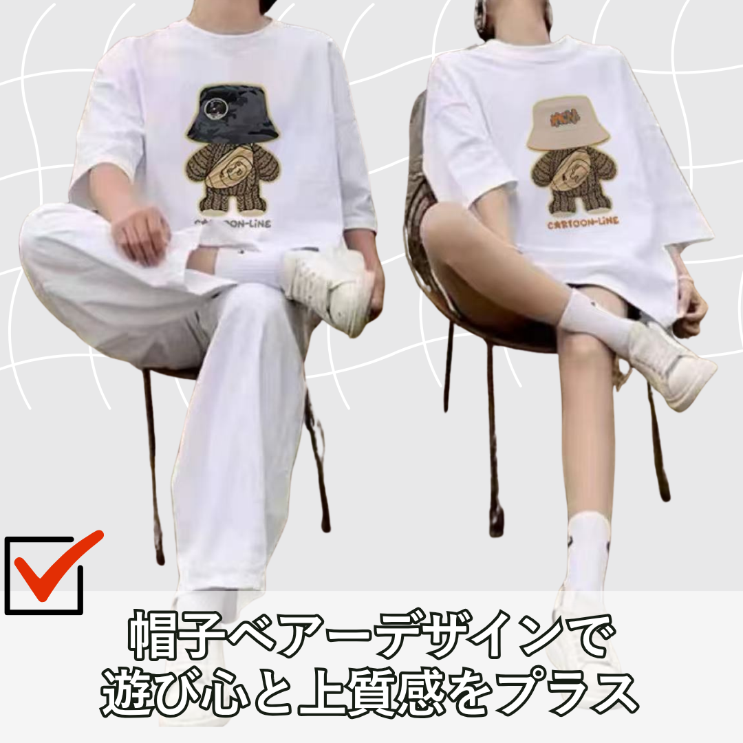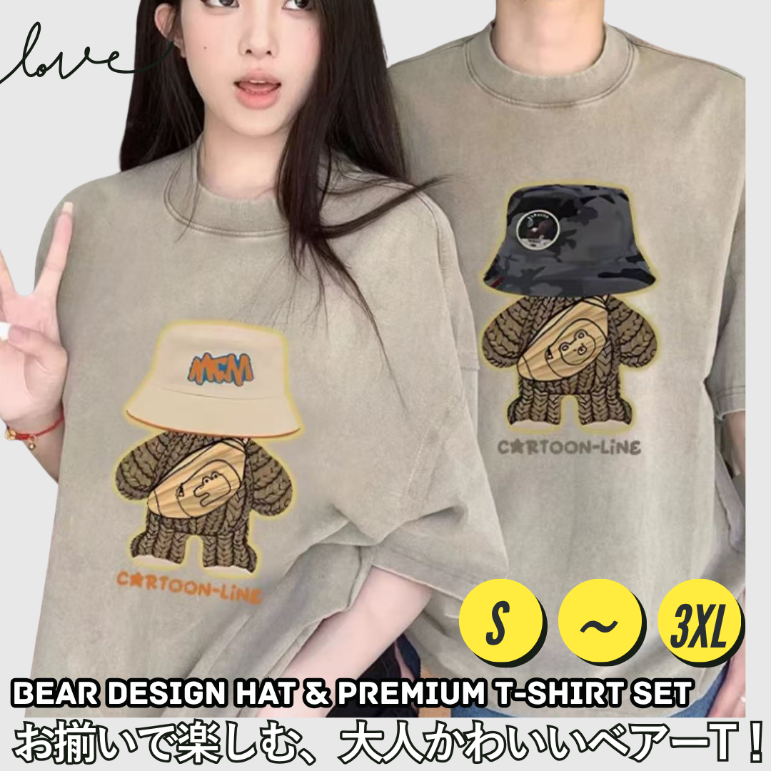 カップルペアルック 帽子ベアーデザイン 高級感Tシャツ【2点セット】