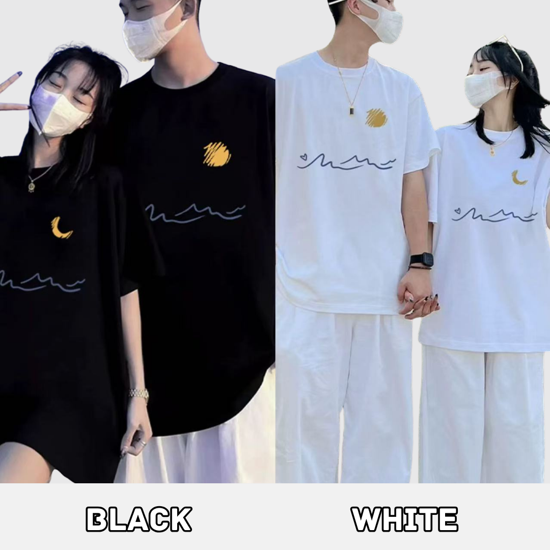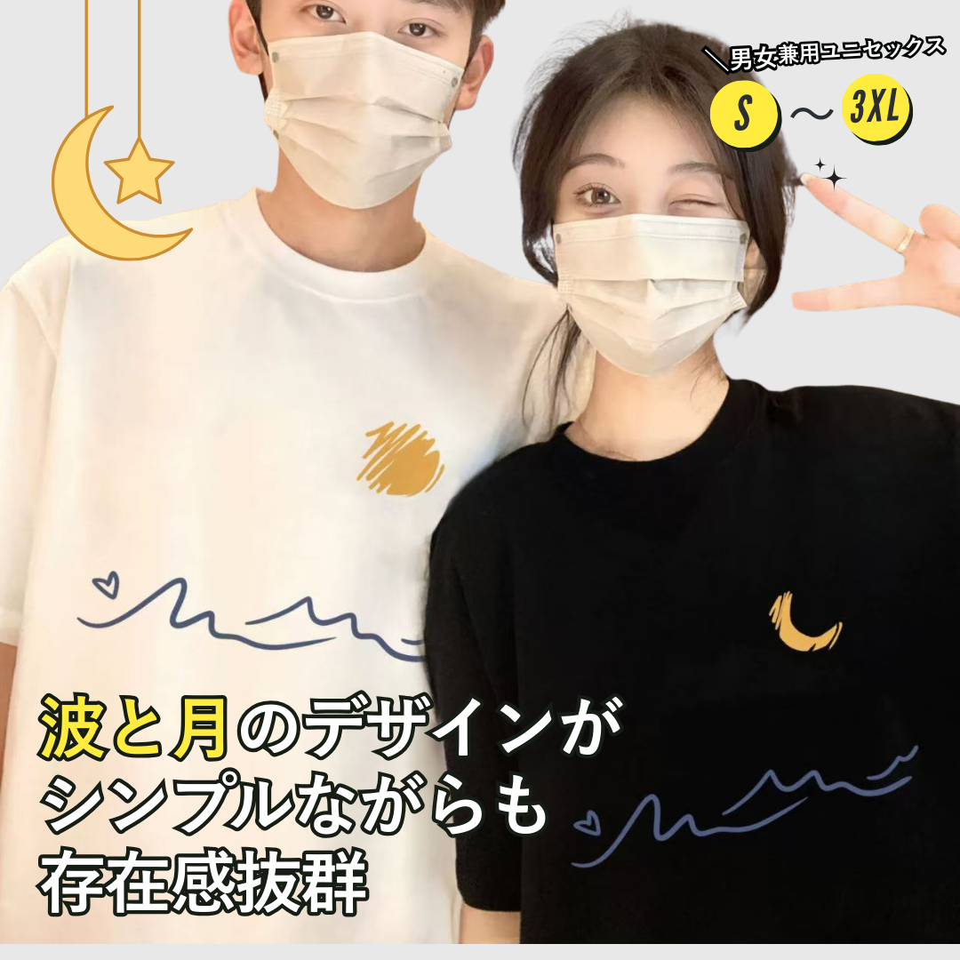 カップルペアルック 月夜の波を描くロマンティックTシャツセット