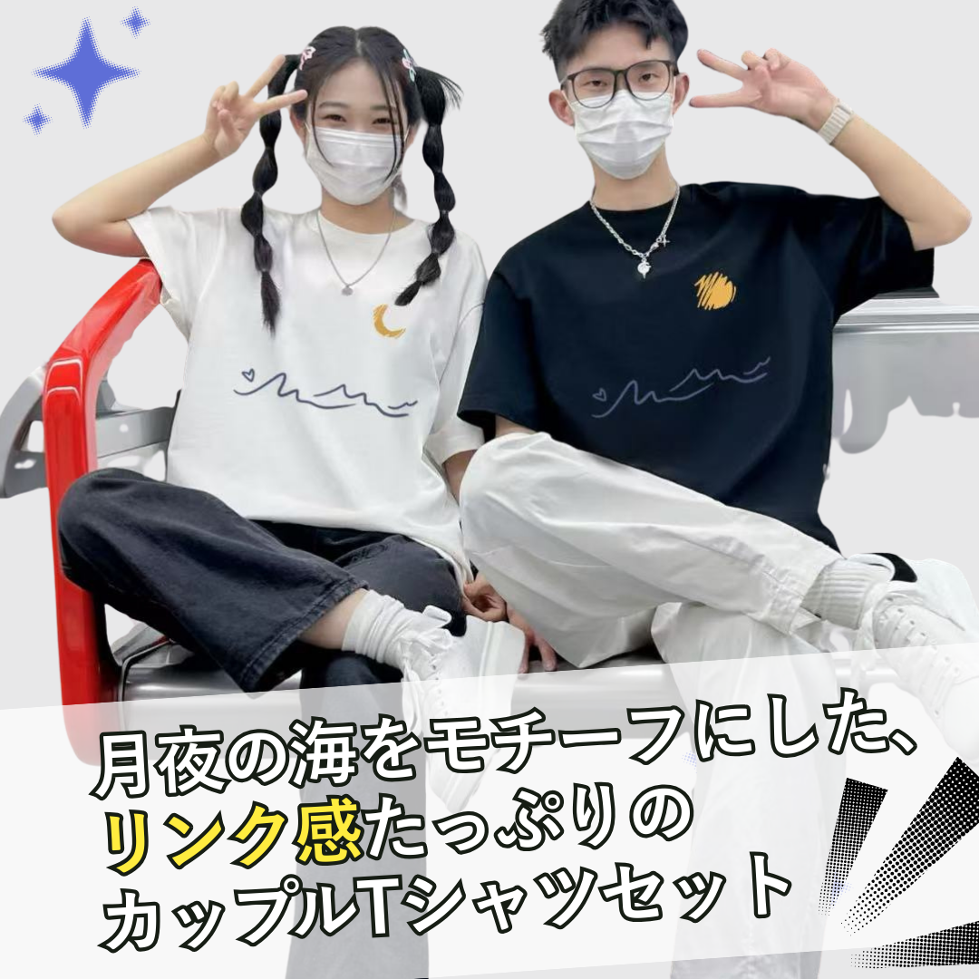 カップルペアルック【月夜の波ロマンティックTシャツセット】は、幻想的なデザインで二人のスタイルを引き立てるアイテムです。月夜に揺れる波を描いたモチーフが、カジュアルでありながら心に残るロマンティックな印象を与えます。ユニセックス仕様でお揃いコーデを楽しめ、共に着ることで特別な絆を感じられる一着です。美しいデザインが二人の個性を際立たせ、日常から特別なシーンまでおしゃれに演出します。