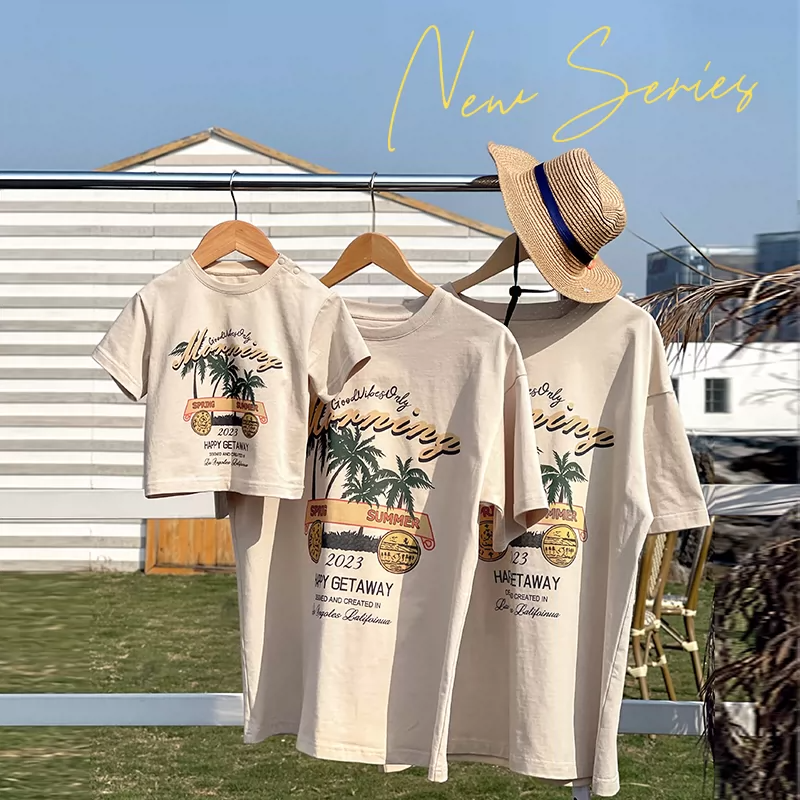 リゾート気分を楽しめる、爽やかなプリントデザインが魅力の親子ペアルック。