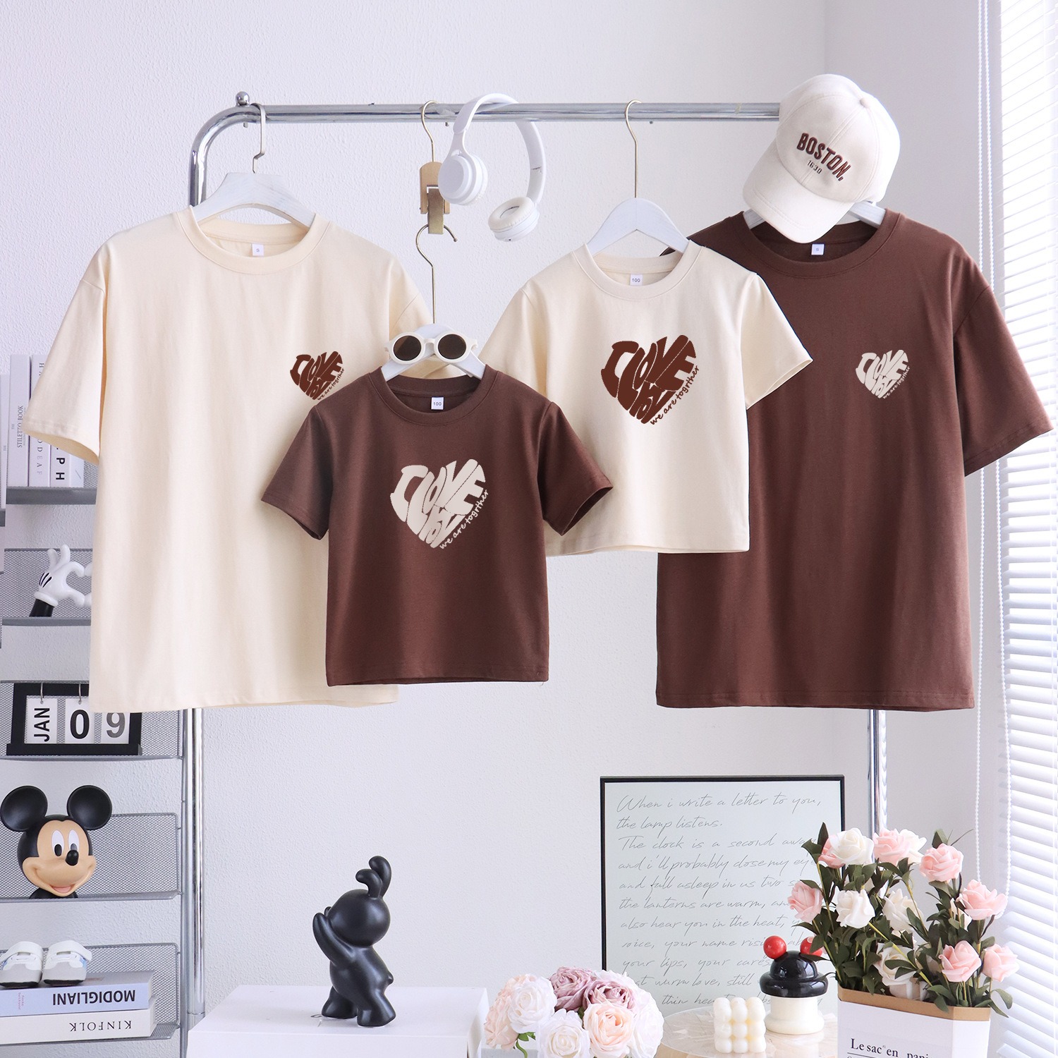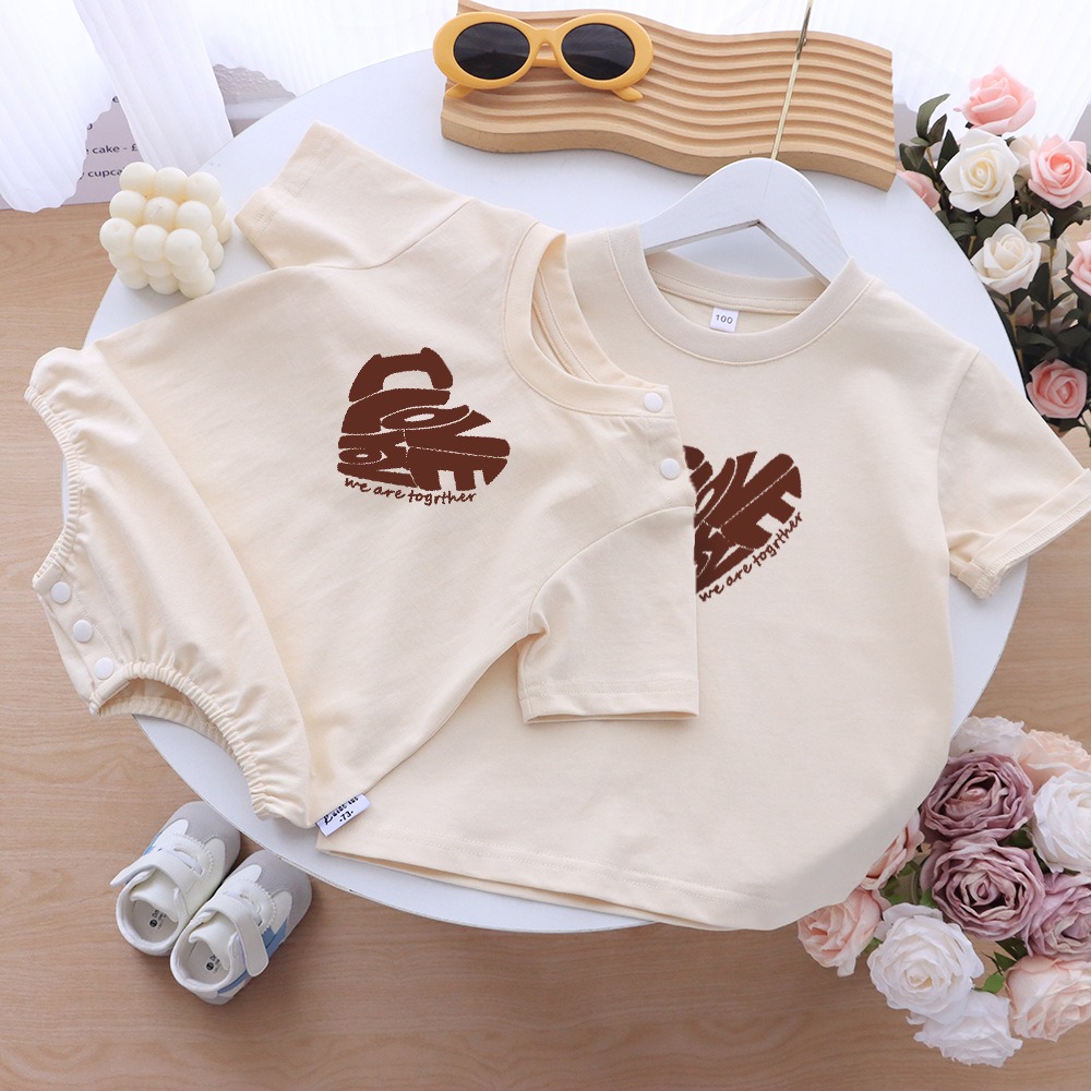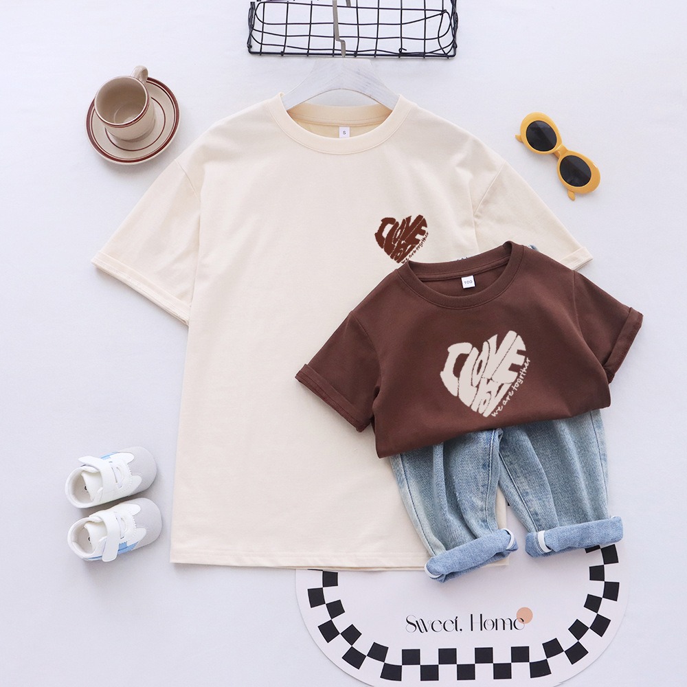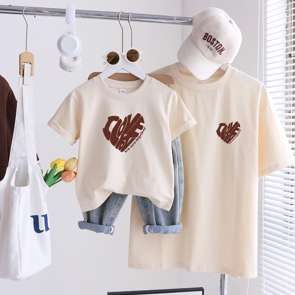 温かみのあるナチュラルカラーと、やさしいハートロゴが魅力の親子ペアルックシリーズ。家族の絆をさりげなく表現できる一着です。