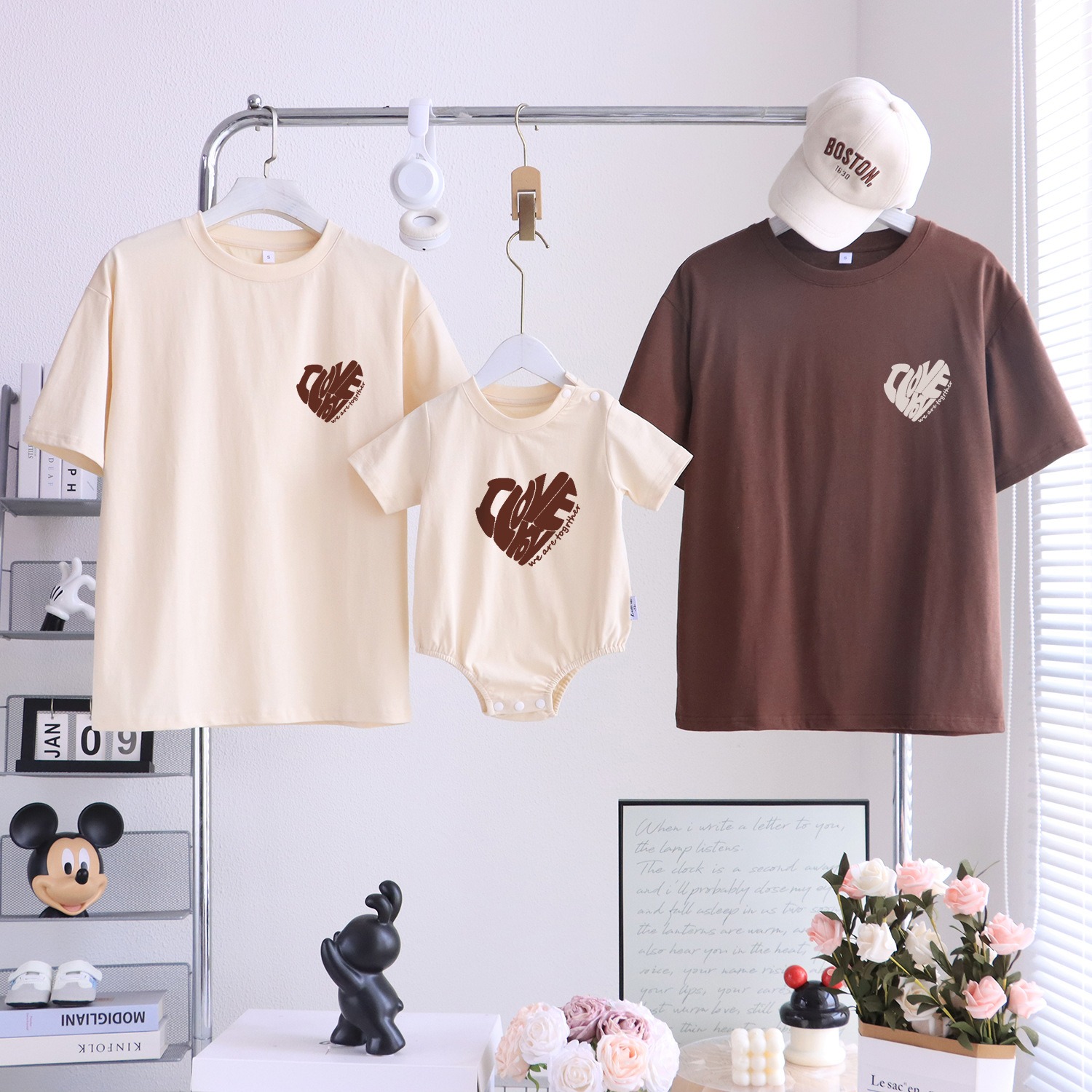 ベビー用ロンパースやキッズ用Tシャツはフロントに大きくロゴを配置し、愛らしさをしっかり演出。パパ・ママ用はゆったりとしたシルエットで、日常使いにも取り入れやすいデザインです。