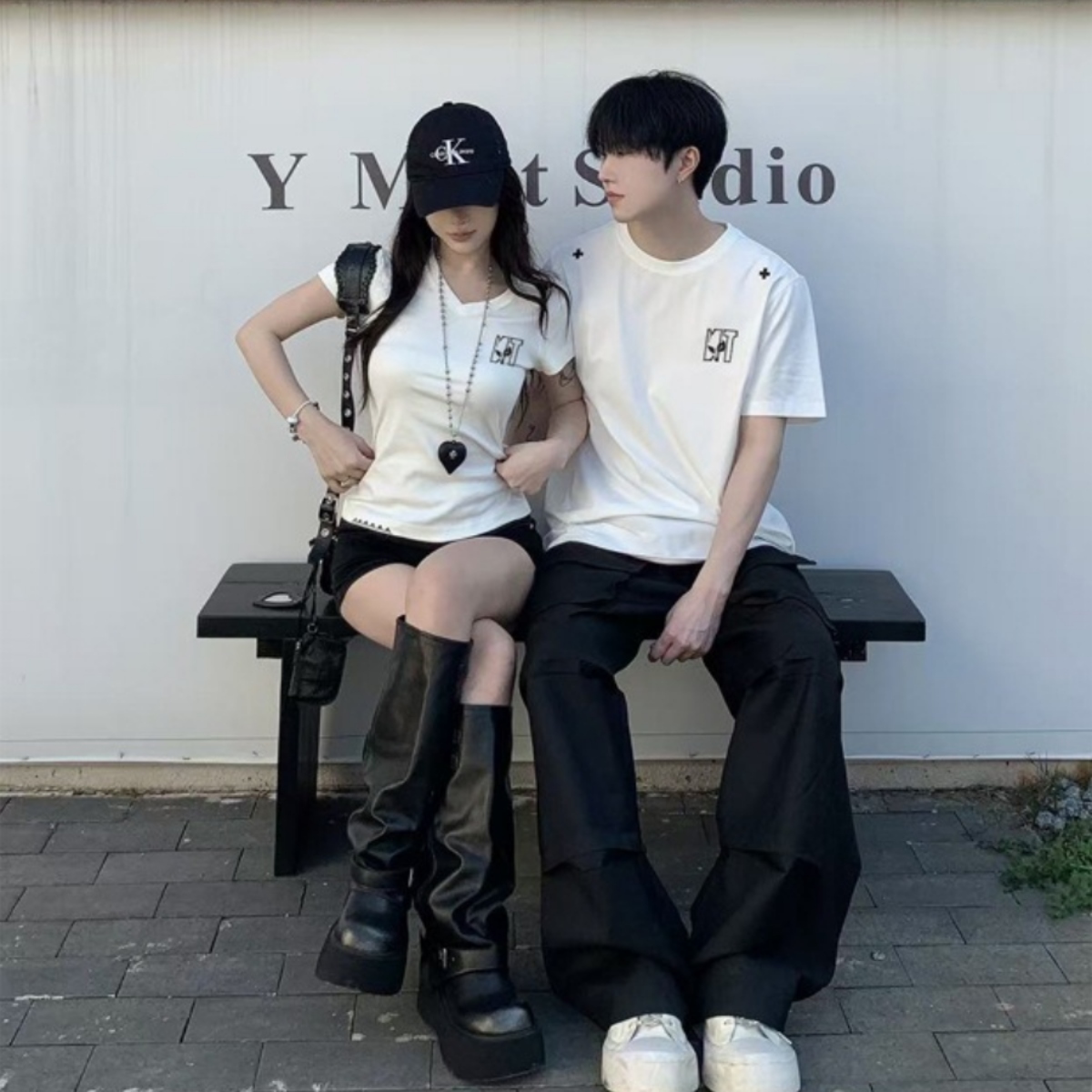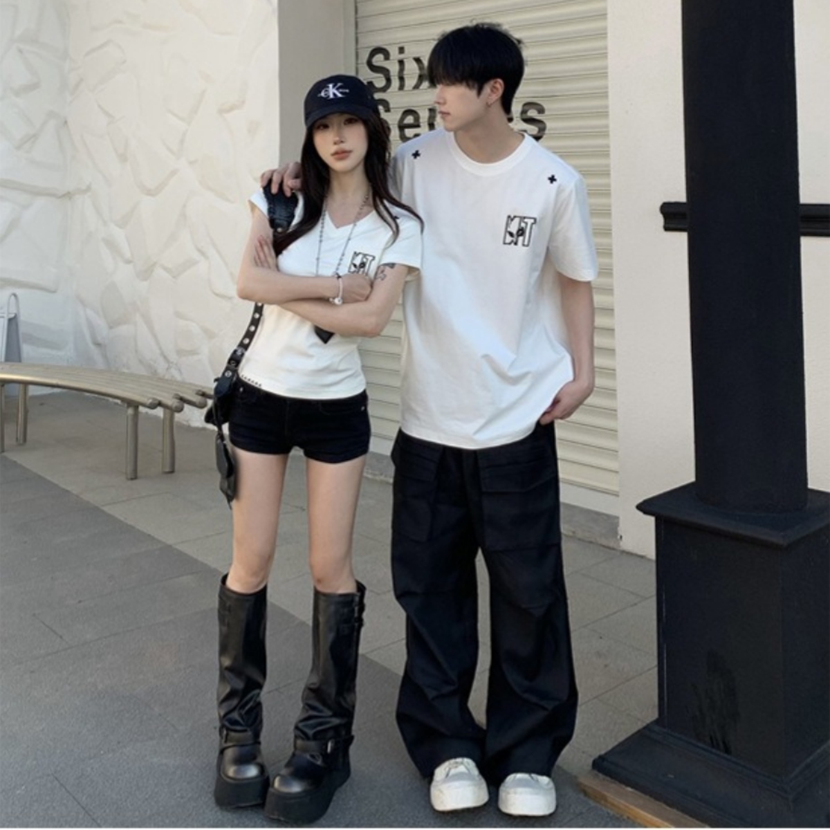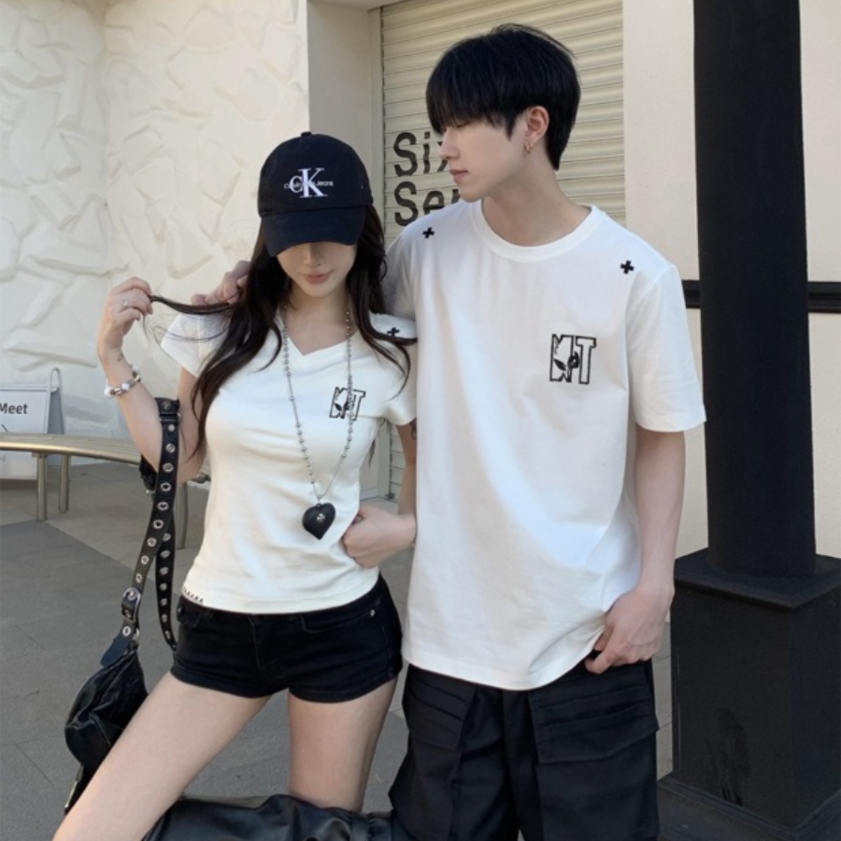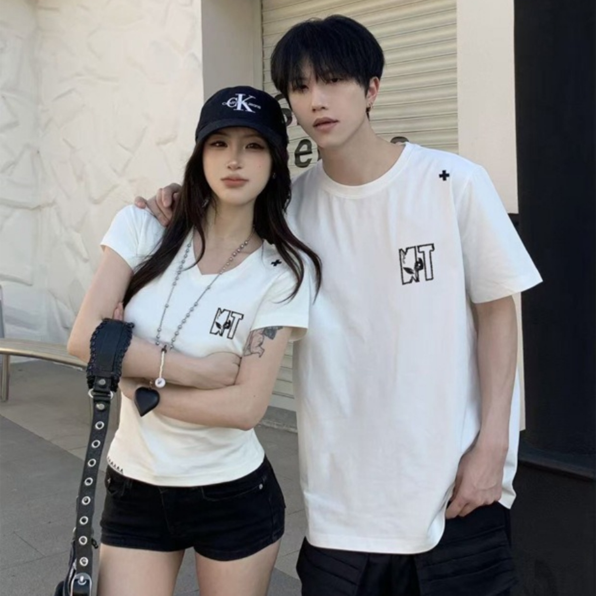 シンプルな中にさりげないリンク感を楽しめる、洗練されたカップルペアルックTシャツ。