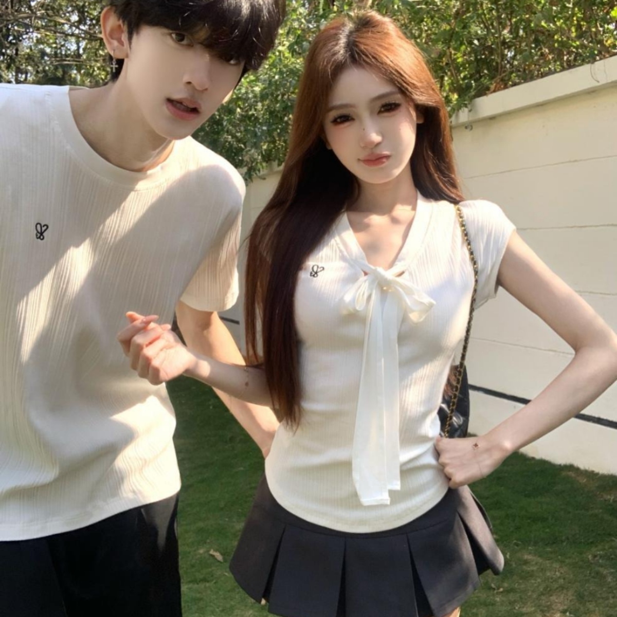 カップルペアルック ワンポイント刺繍 Tシャツ&ボウタイトップス