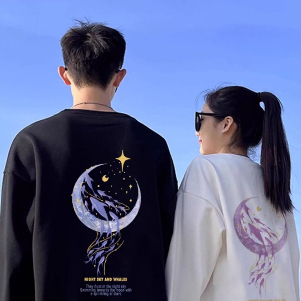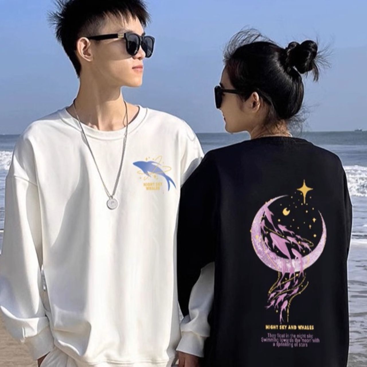 カップルペアルック【月夜にきらめく イルカトレーナー 2点セット】は、月明かりの下を舞うイルカを描いた幻想的なデザインが魅力のユニセックスアイテムです。アートのような美しさと快適な着心地を両立し、リラックス感のあるスタイルを演出します。お揃いで着れば特別な絆を感じられ、デートやアウトドア、おうち時間などさまざまなシーンで活躍します。おしゃれで存在感のある一枚です。