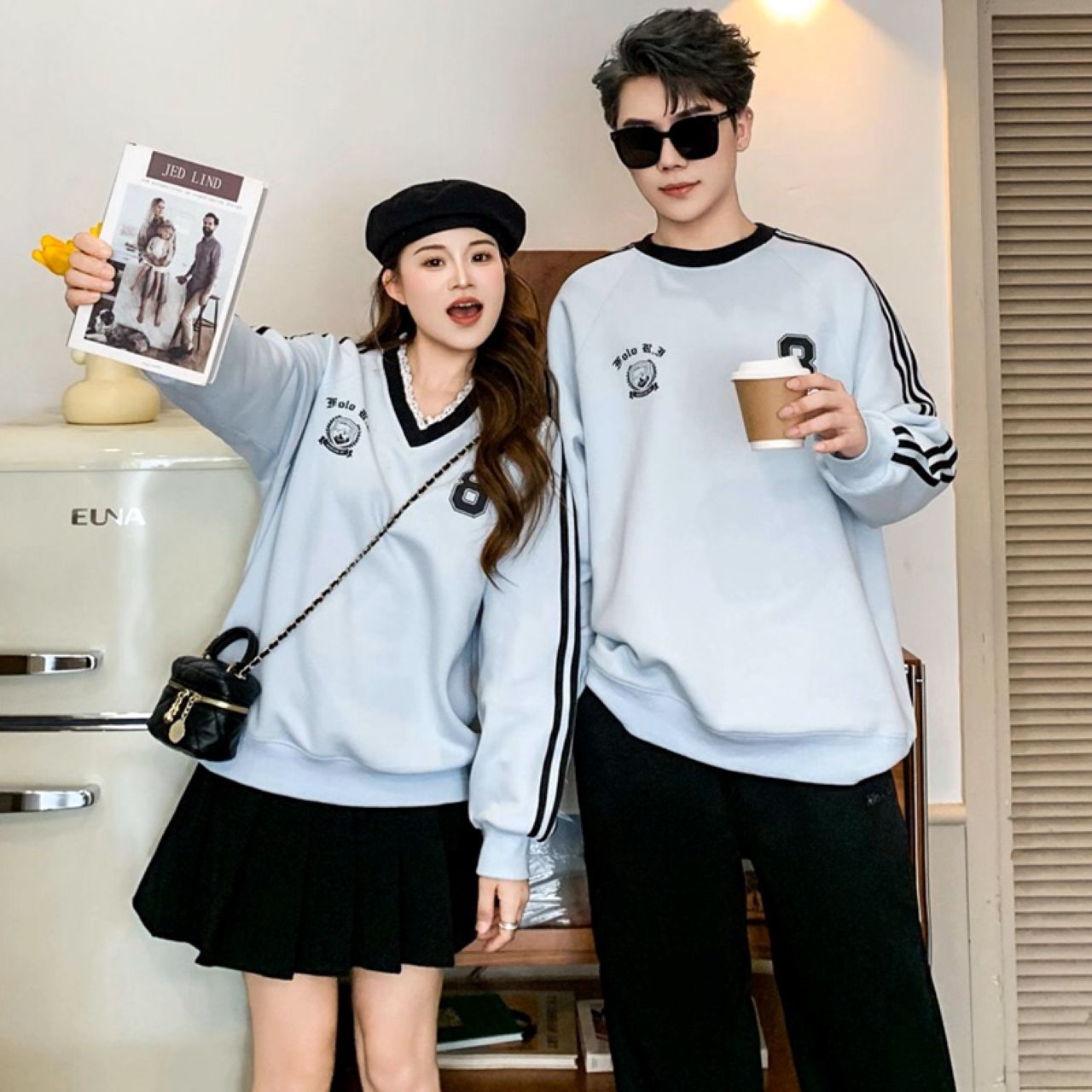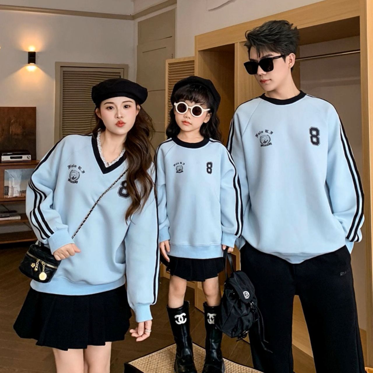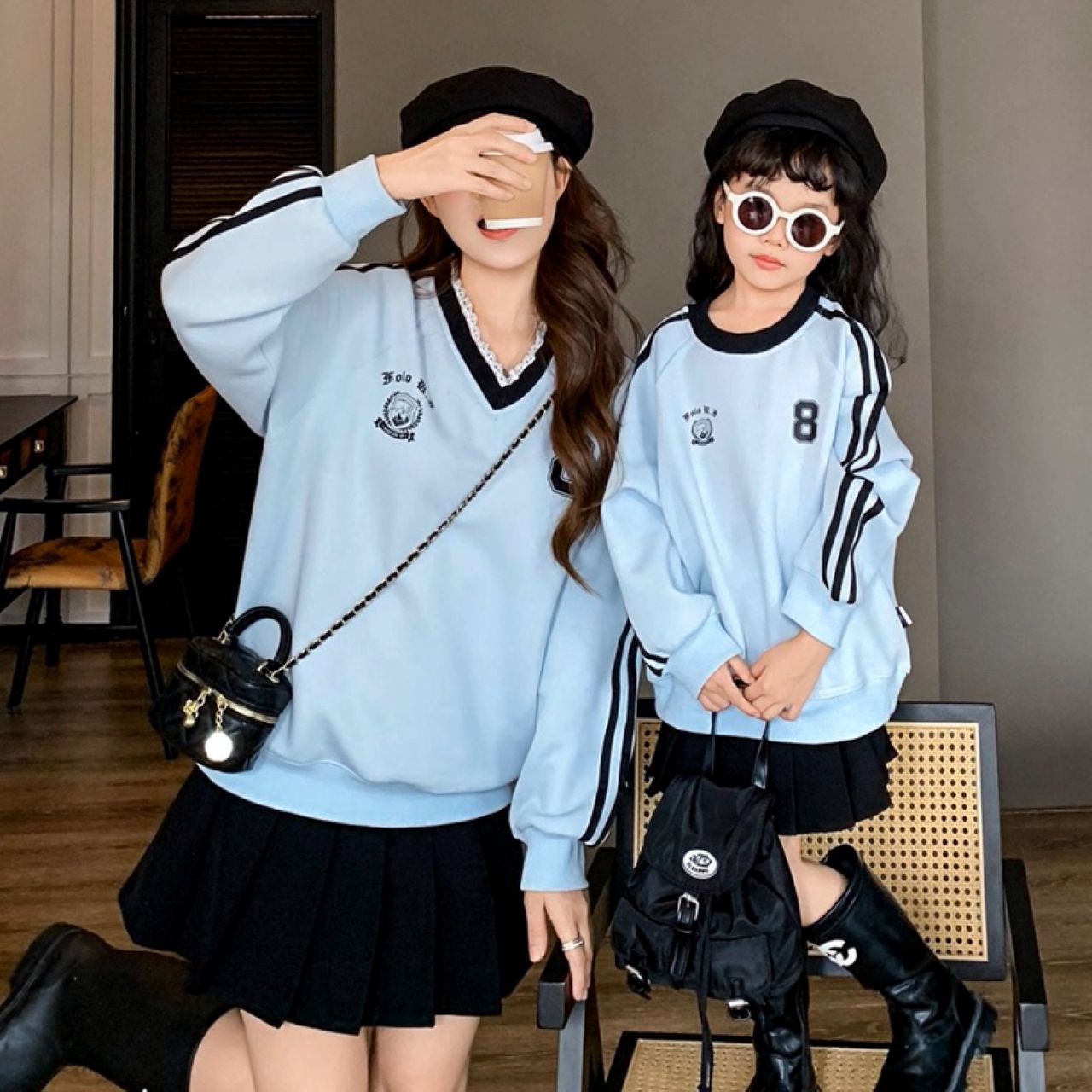 親子ペアルック【8ロゴ ライン入り ブルートレーナー】は、シンプルながらスポーティーな8ロゴとラインが映える、センスあふれるアイテムです。胸元の「8」とエンブレム、袖の3本ラインが印象的で、親子のスタイルをよりおしゃれに引き立てます。レディースのみVネックにレースをあしらい、ほどよい甘さをプラス。ユニセックスデザインで親子リンクを楽しめ、休日のお出かけやリラックスタイムにもぴったりな一枚です。