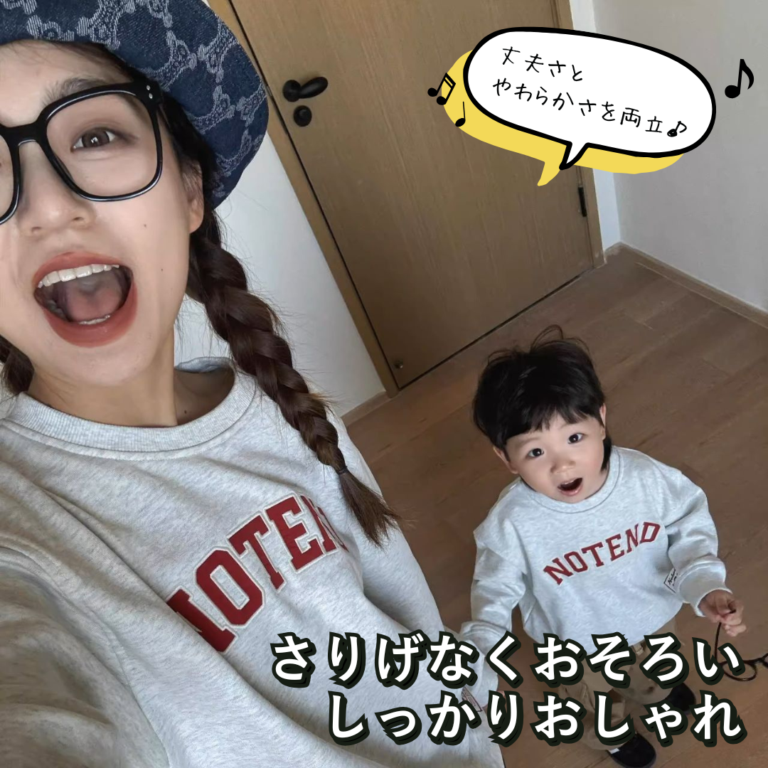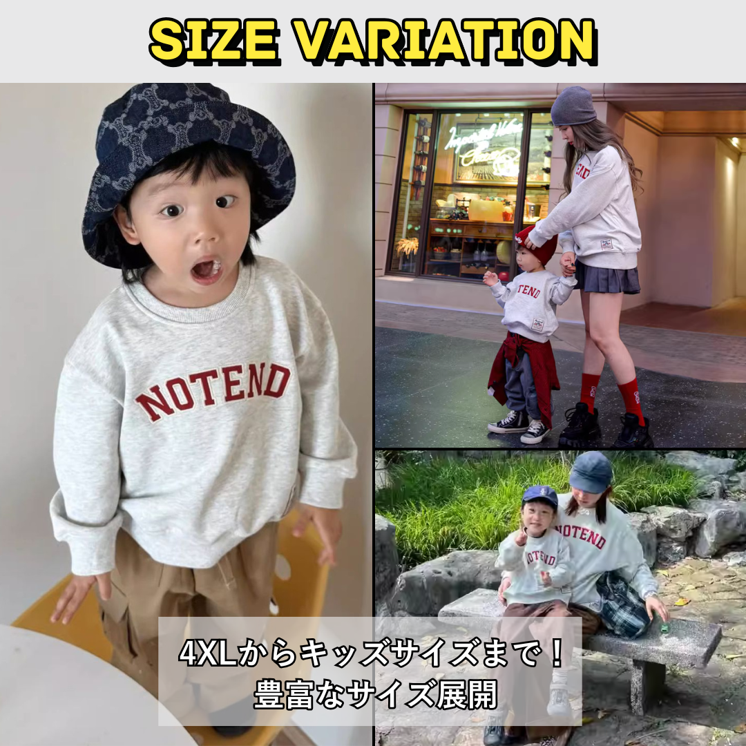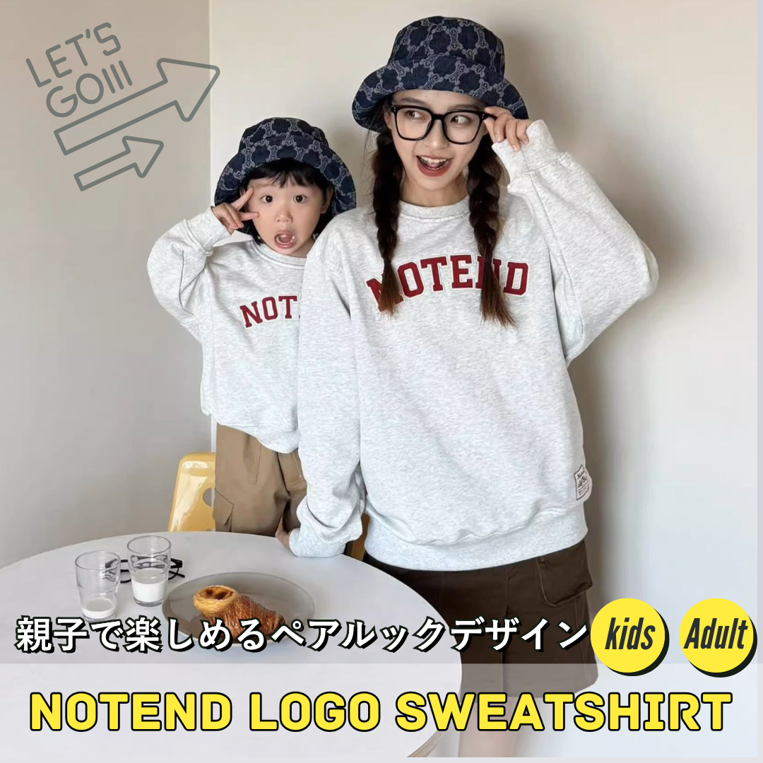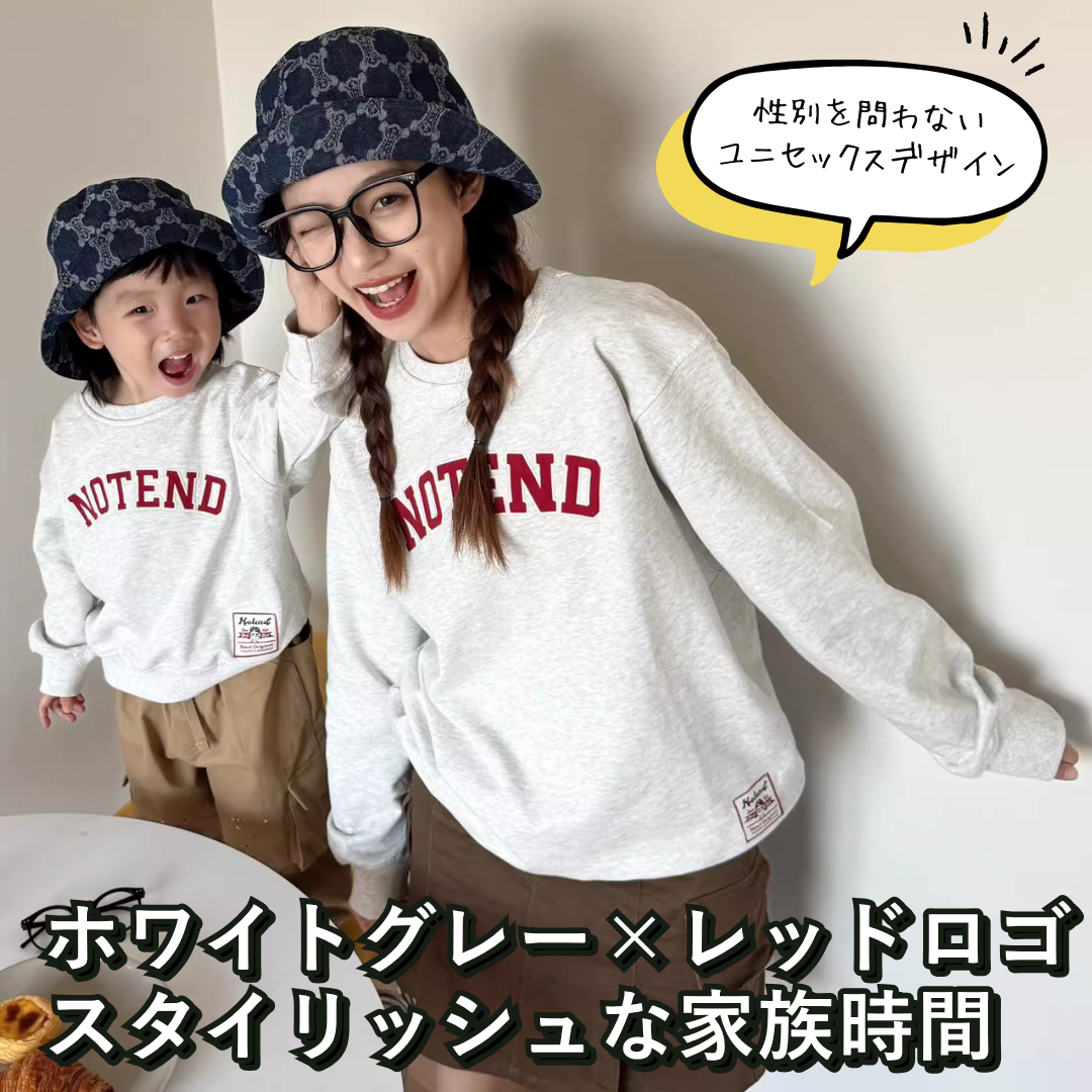 シンプルで洗練されたロゴが特徴の親子ペアルックにピッタリのトレーナーです。ホワイトグレーにレッドのNOTENDロゴが映え、カジュアルながらどんなシーンにも馴染みます。ユニセックスデザインで性別問わず親子でお揃いにでき、特別な絆を感じながらあたたかい雰囲気を演出します。お出かけやリラックスタイム、家族写真など、さまざまなシーンで活躍する一着です。