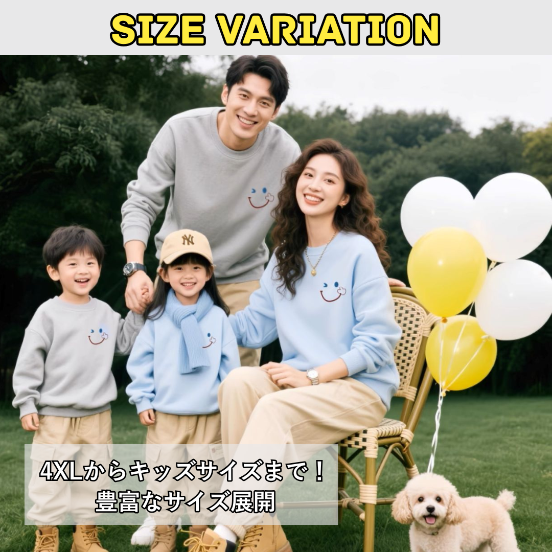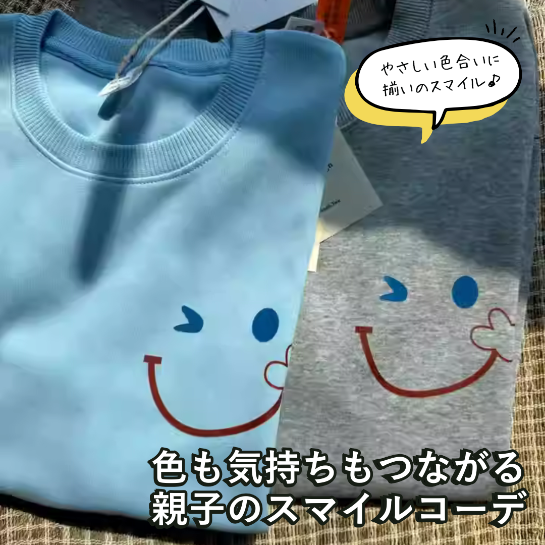 笑顔あふれるスマイルピースのデザインが可愛い、親子の絆を深める【スマイルピース トレーナー】です。ライトブルーとライトグレーのやさしい色合いで、どちらを選んでもリンクコーデが楽しめます。ユニセックスで着られるため、親子で一緒に明るい気持ちをシェアできるのも魅力。公園のお散歩や家族でのお出かけにぴったりの、ハッピーな雰囲気をプラスしてくれるアイテムです。