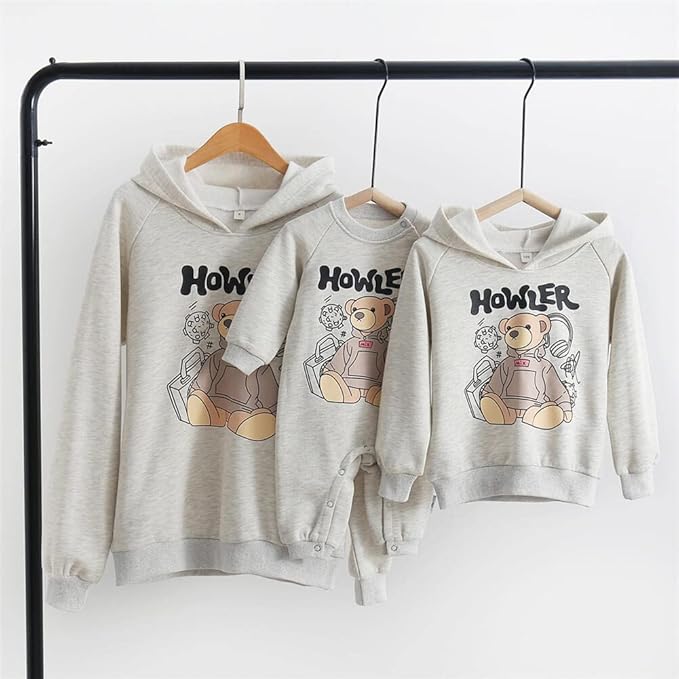可愛らしいベアプリントが目を引く、親子で楽しめるペアルックパーカー&ベビーロンパース。ナチュラルな杢グレーに、遊び心のある「HOWLER」ロゴが程よいアクセントになり、写真映えも抜群です。大人用・キッズ用はフード付き、ベビー用は着脱しやすいスナップボタン仕様で、日常使いにも配慮。柔らかな肌触りのスウェット素材を使用し、動きやすく快適な着心地を実現しました。お出かけやリンクコーデはもちろん、ギフトにもおすすめの親子ペアルックアイテムです。