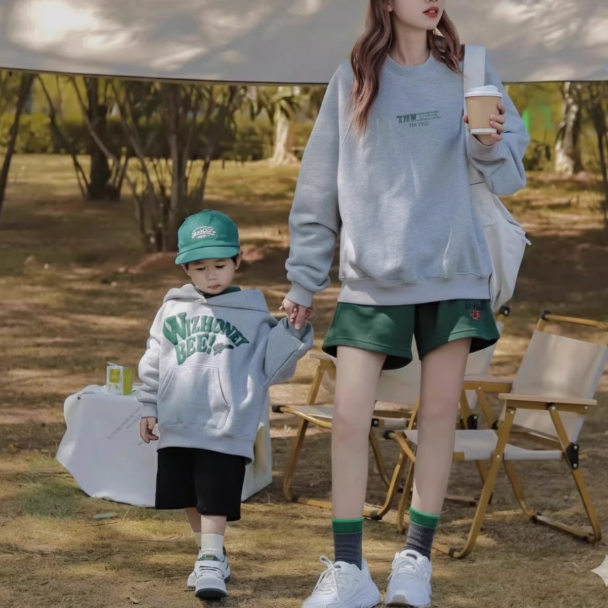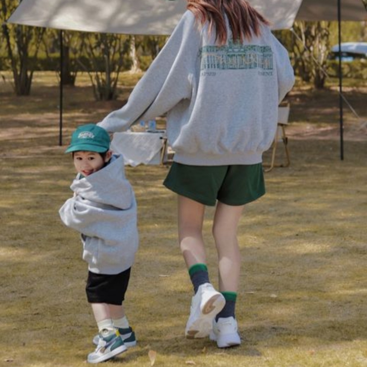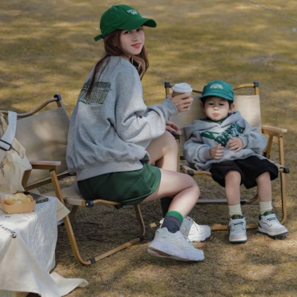 爽やかなグリーンロゴが映える、親子で楽しめるペアルックパーカー・トレーナー。 落ち着いたグレーベースにグリーンを効かせたデザインで、カジュアルながらも程よくトレンド感のある仕上がりです。 大人用はゆったりとしたシルエットで、リラックス感のある着こなしに。キッズ用も動きやすく、元気に遊ぶ日のお出かけにぴったりです。 柔らかなスウェット素材を使用し、肌触りが良く、長時間の着用でも快適。公園やキャンプ、旅行などのシーンはもちろん、写真映えするリンクコーデとしても活躍します。 普段使いしやすく、初めての親子ペアルックにもおすすめの一着です。